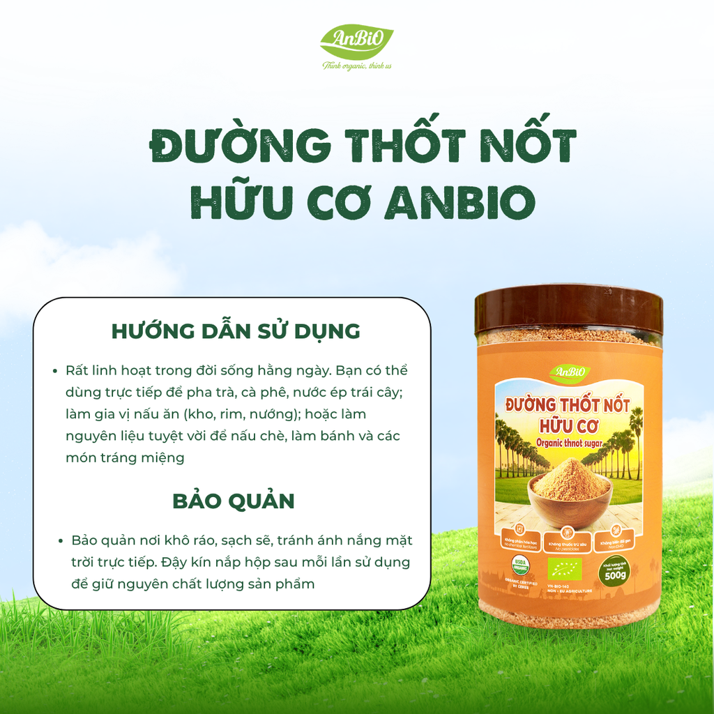 Đường thốt nốt AnBiO là kết quả từ sự hợp tác độc quyền nguồn nguyên liệu giữa AnBiO và thương hiệu Confirel - đơn vị sở hữu vùng nguyên liệu 215 ha tại Campuchia. Sản phẩm được kiểm định, hoàn thiện tại Việt Nam trong nhà máy đạt tiêu chuẩn ISO, đảm bảo: