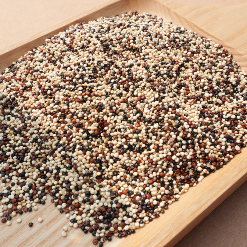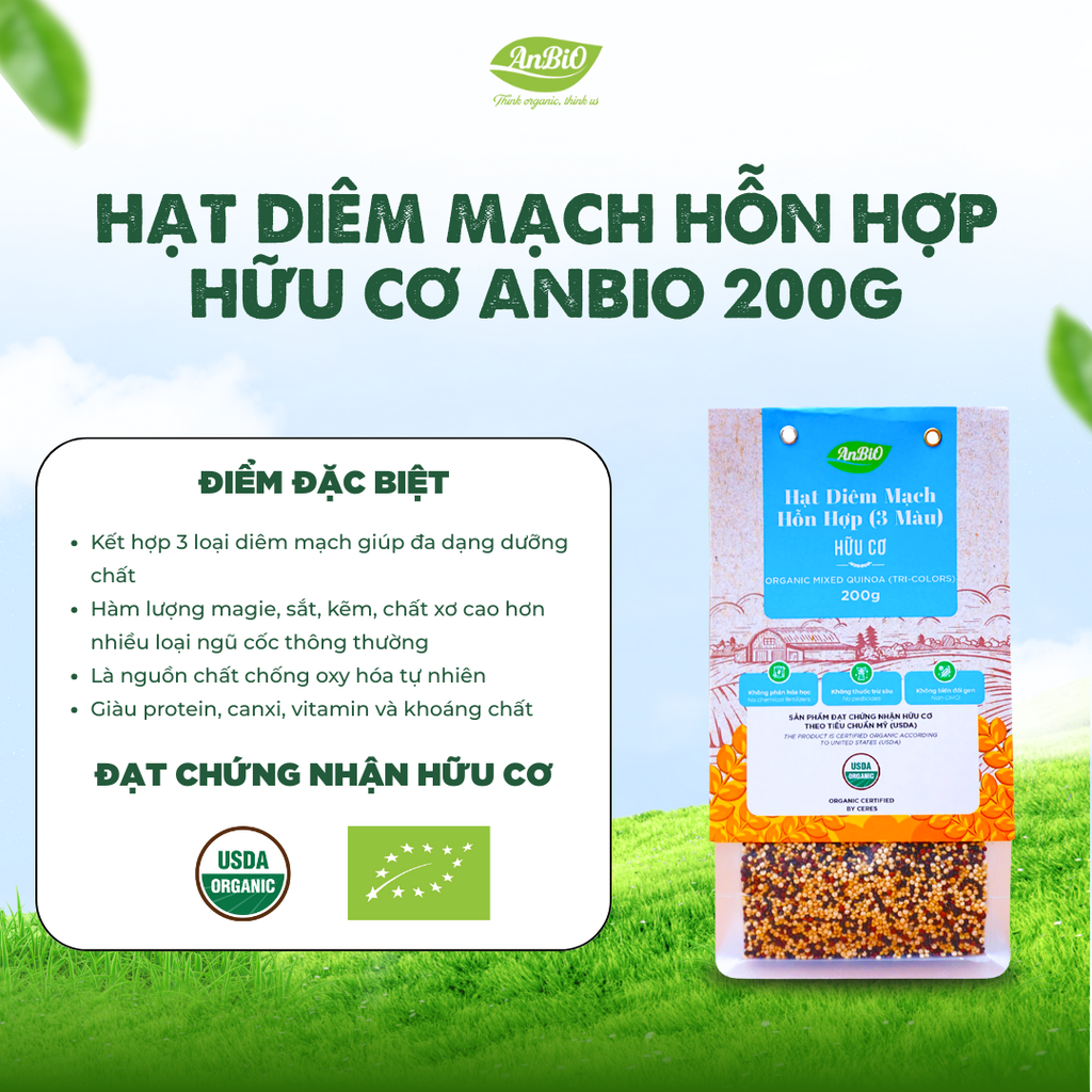 Sản phẩm chứa 100% hạt diêm mạch trắng, đen, và đỏ hữu cơ, được chứng nhận hữu cơ bởi USDA và EU, đảm bảo nguồn gốc và chất lượng.