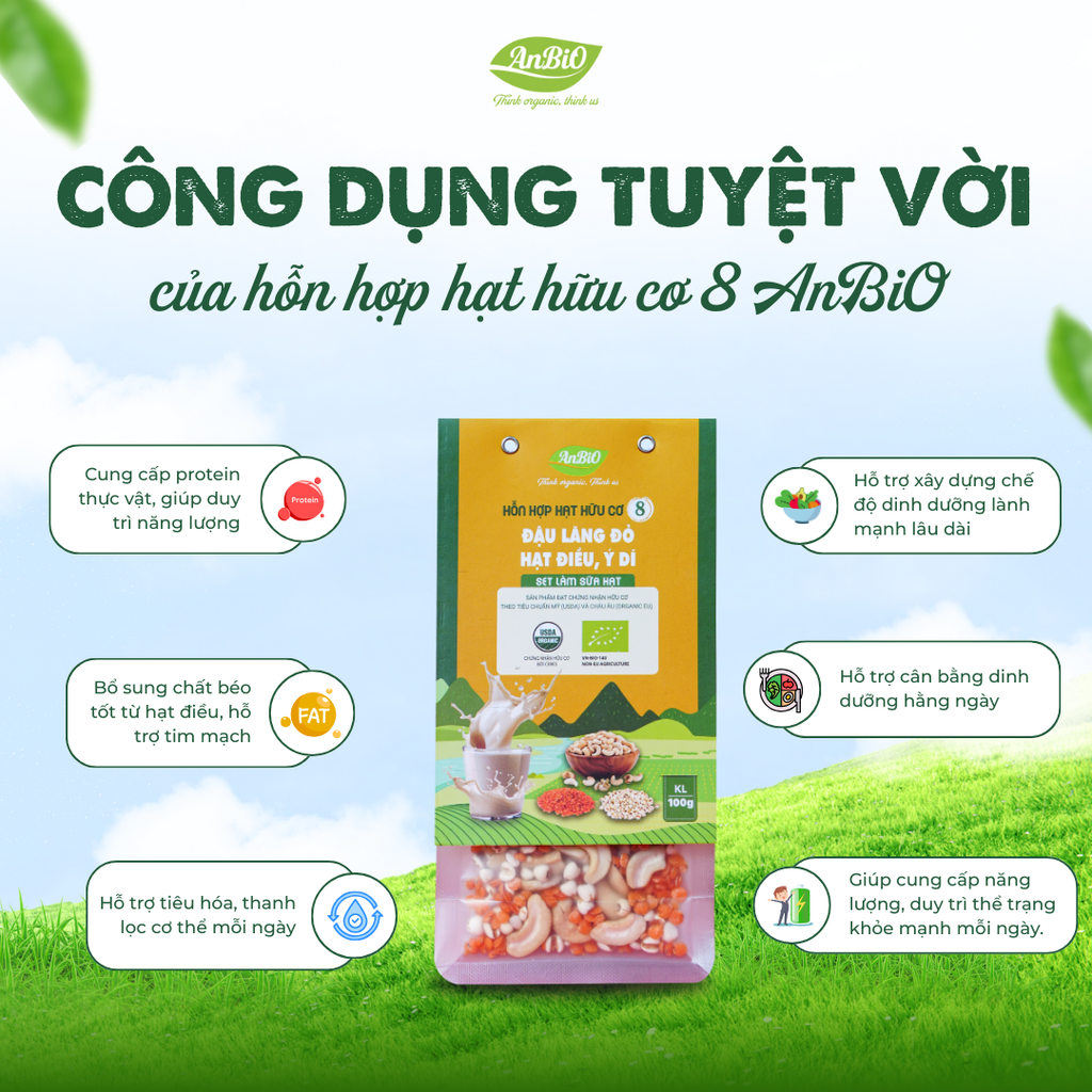 Hỗn hợp hạt Anbio được sản xuất từ nguồn nguyên liệu hữu cơ đạt chuẩn cao nhất, cam kết mang đến sự thuần khiết và an toàn trong từng sản phẩm. Sản phẩm đạt chứng nhận USDA và EU, minh chứng cho chất lượng và độ tin cậy.