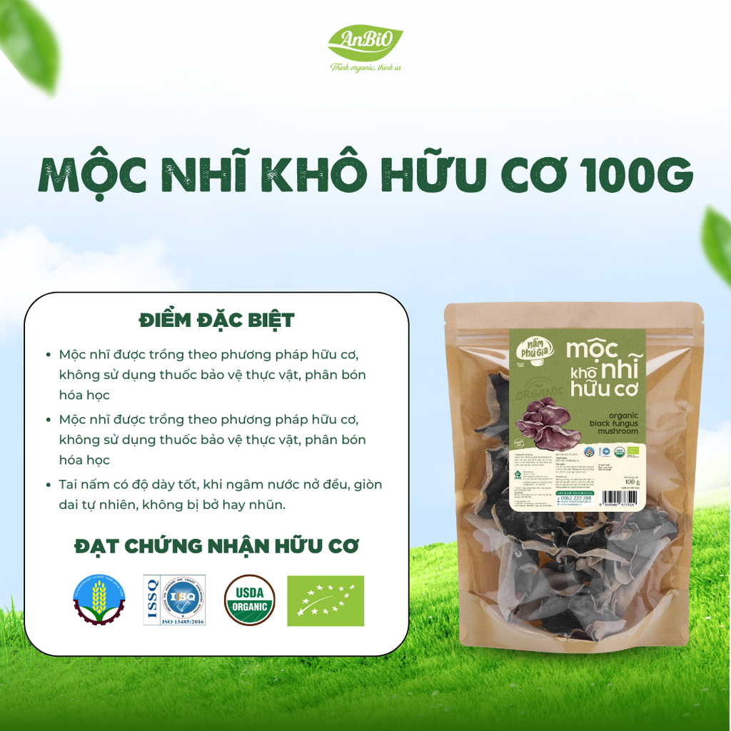 Mộc nhĩ khô có tai dày, màu nâu đen tự nhiên, khi ngâm nở to, giòn dai và giữ được độ sần đặc trưng. Đây là nguyên liệu quen thuộc trong nhiều món ăn truyền thống và hiện đại